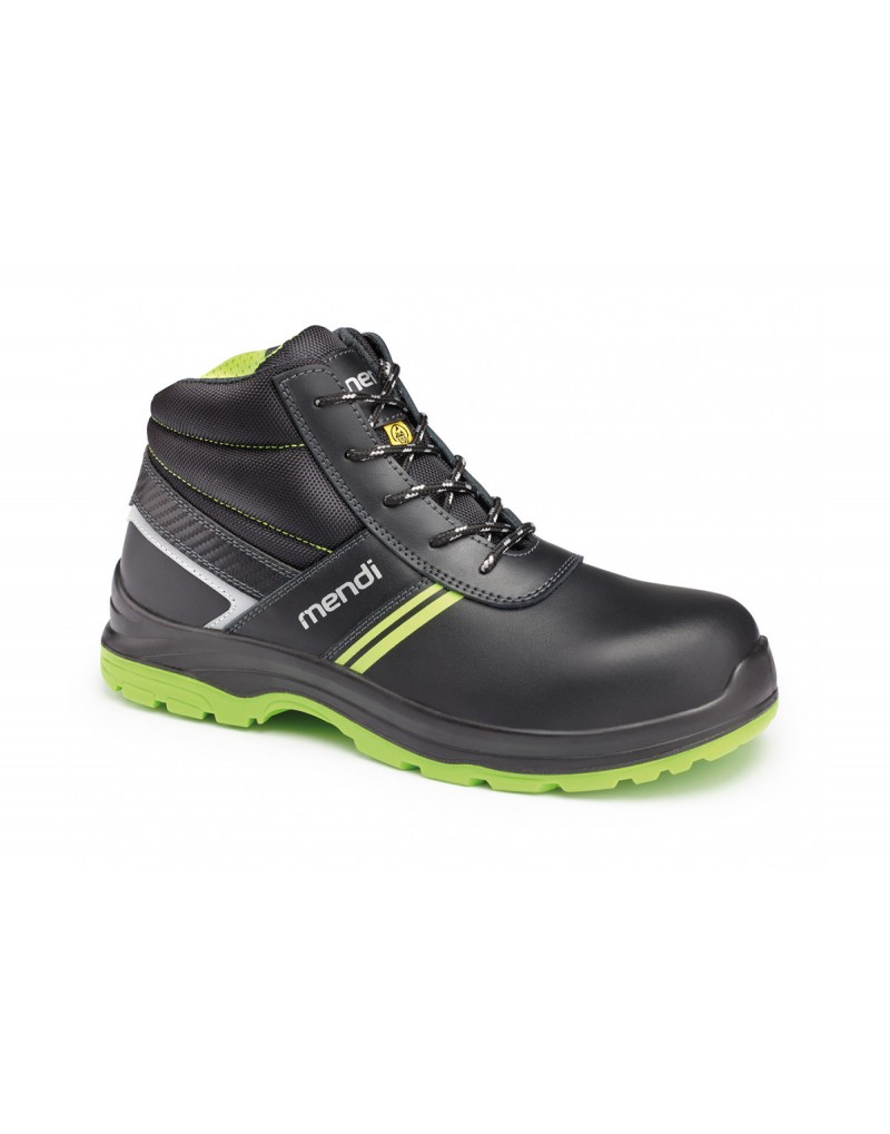 doble densidad bicolor y antideslizante SRC. Puntera de seguridad de fibra de vidrio, anatomica, amagnética y plantilla antiperforación multicapas textil. Cierre áncora/cordones. Plantilla antibacteriana termoconformada. Reflectantes de visibilidad
