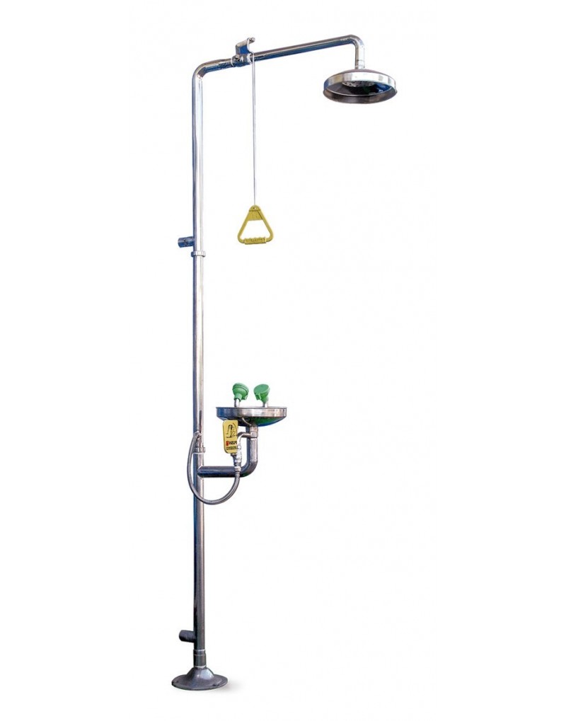 Ducha-lavaojos fabricada íntegramente en acero inoxidable, para ser usada en casos de salpicaduras de elementos nocivos a los ojos o al cuerpo del trabajador, en el que el agua produzca un efecto de arrastre de la sustancia nociva.