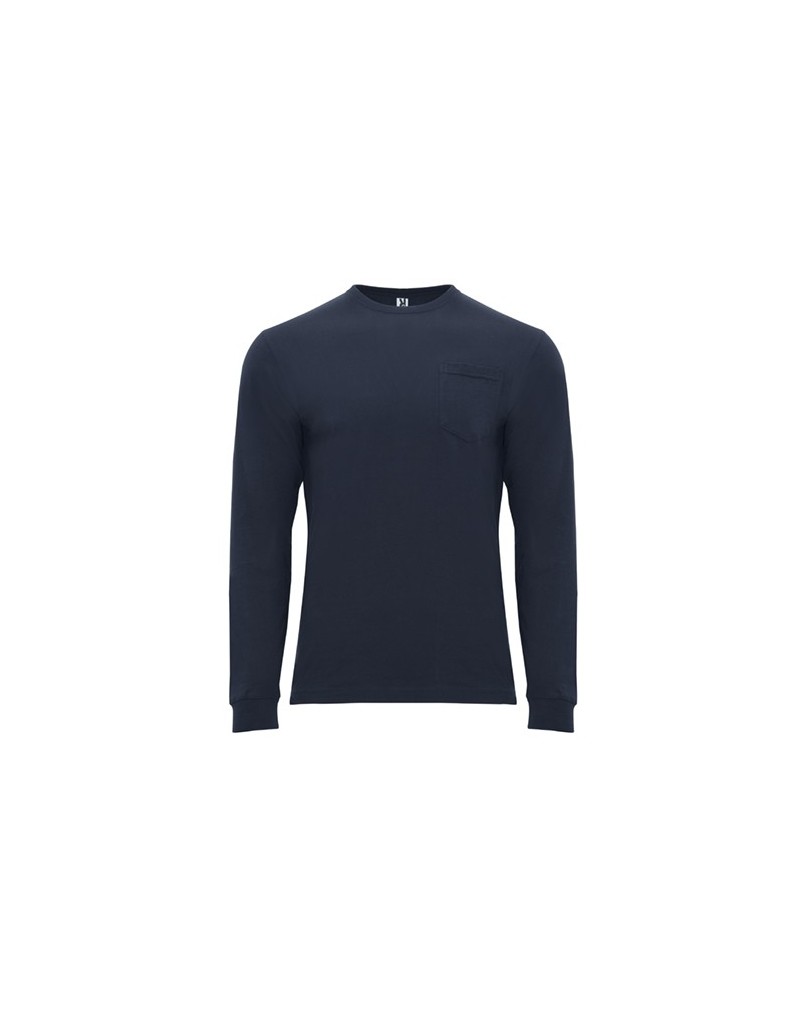 Camiseta de manga larga con cuello redondo y puños en canalé 1x1. Bolsillo en pecho izquierdo. Cubre costuras reforzado en cuello y hombros.