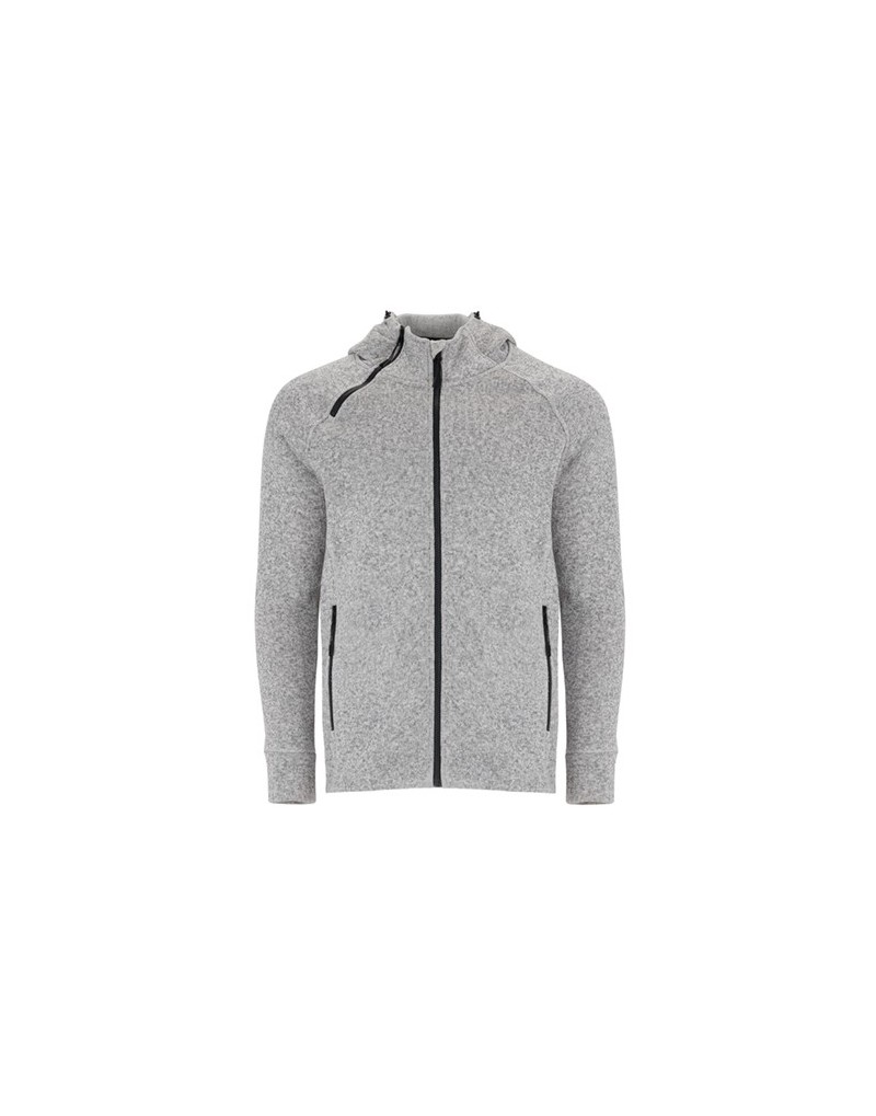 Chaqueta de punto felpado con capucha. 1. Cremalleras inyectadas con tiradores de diseño. 2. Cremallera central con protector de barbilla. 3. Cuello alto con ajustadores de diseño y cubrecosturas interior. 4. Segunda cremallera decorativa en cuello para facilitar apertura. 5. Dos bolsillos frontales con cremallera. 6. Bajo trasero más largo que el delantero, con ajustadores de diseño.
