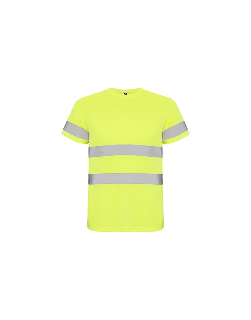 Camiseta técnica de manga corta de alta visibilidad. Cuello redondo en el mismo tejido, con cubrecosturas reforzado en la parte interior del cuello. Dos cintas reflectantes horizontales en torso y una en mangas.